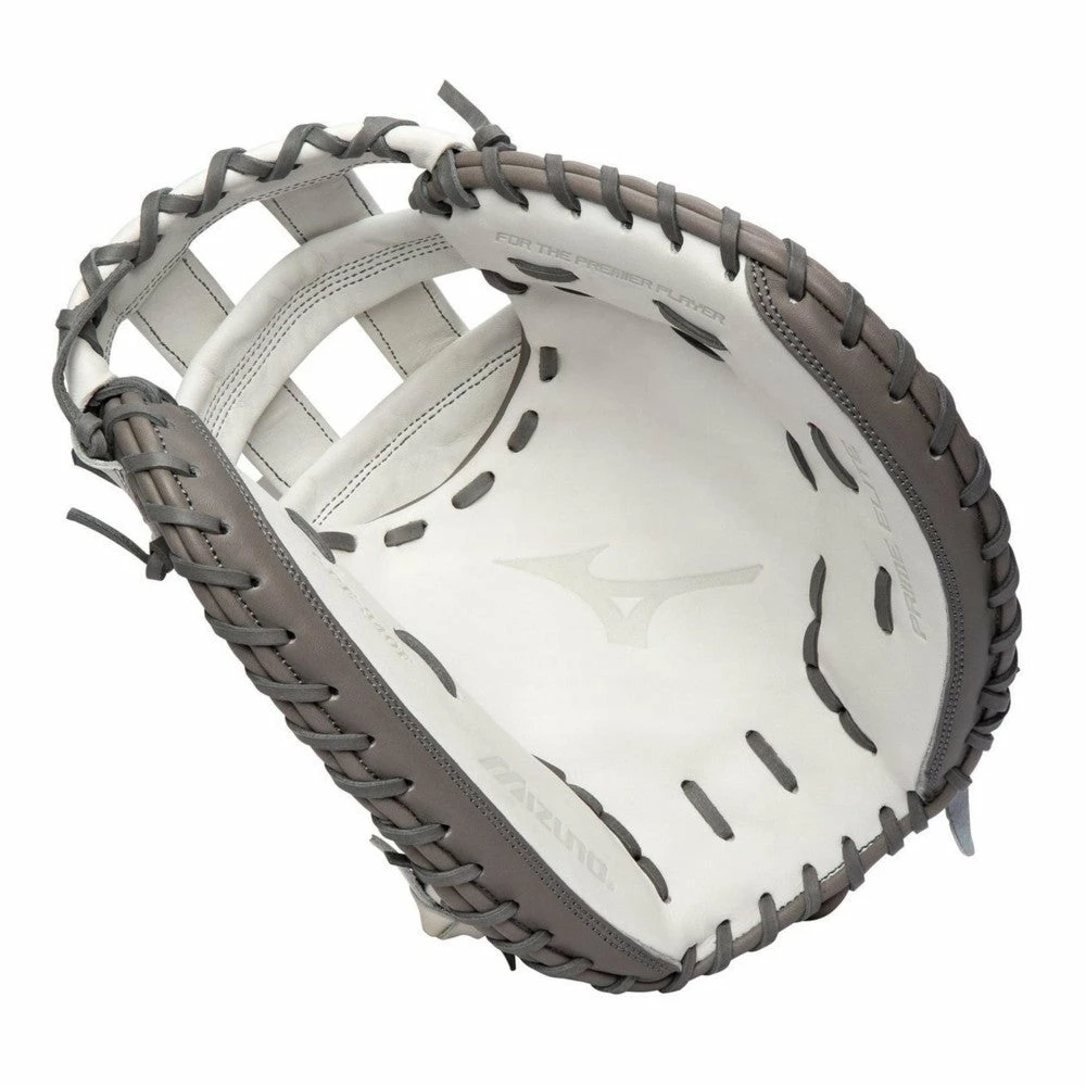 The Mizuno Prime Elite 34 in Fastpitch Catchers Mitt is the perfect fastpitch catcher’s mitt for serious players. When it comes to building the perfect fast pitch softball catcher’s glove Mizuno decided they would try to take the best of both worlds. Some aspects from the past and some from the present. Using soft, smooth white and grey leather the Prime Elite Fastpitch series feels like your favorite gloves of yesteryear with all of the modern attributes that have been developed to help protect and perfect your game. The leather is guaranteed ultra-soft and comes pre-oiled for your convenience in order to reduce break-in time and provide a relaxed, personalized feel that will be retained regardless of use. Power Lock technology installed in the pocket enhances catching ability and stabilizes the key pressure points in the glove responsible for keeping the ball secure while allowing for quick transfers to your throwing hand.